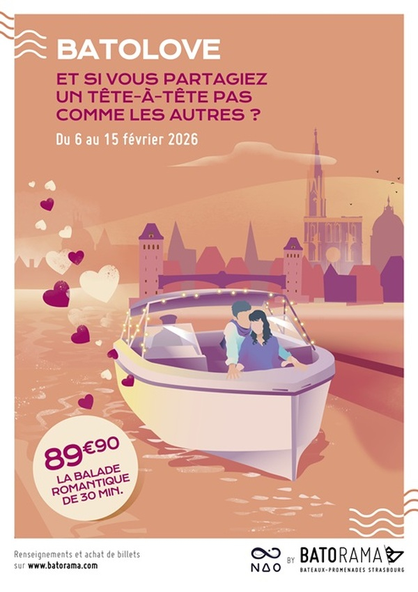 Et si vous partagiez un tête-à-tête pas comme les autres ? Dans le cadre du festival Strasbourg mon amour, Batorama vous propose un rendez-vous inédit du 6 au 15 février 2026 ! Misez sur une escapade intime à bord de NAO, notre bateau de plaisance avec pilote, pour partager un moment unique avec l’être aimé. Du Palais Rohan aux maisons à colombages de la Petite France, en passant devant l'église Saint-Paul et en apercevant la silhouette de la Cathédrale … (re)découvrez sous un autre angle les plus beaux emblèmes de la capitale européenne. Au programme : - 30 min de navigation privée, bercés par l’eau et le charme de Strasbourg, - Un verre de crémant d'Alsace par personne, une bière artisanale Bendorf, ou un soft au choix, - Un bretzel par personne pour la touche locale, - Une photo format polaroïd en souvenir, à partager en taguant @batorama sur les réseaux sociaux avec le hashtag #batolove, - Une ambiance cocooning avec un plaid.