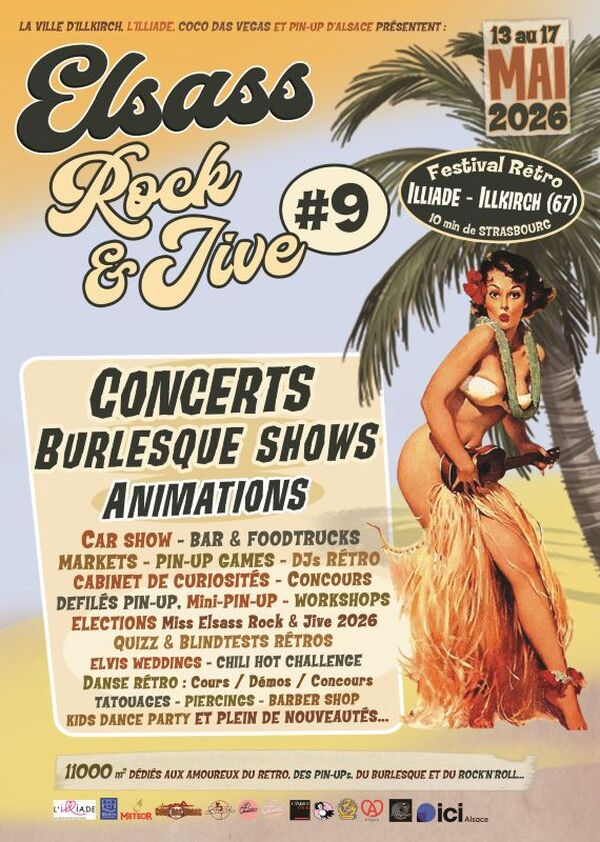 Les amoureux des années 50 vont être au paradis ! Un village rétro avec des stands (habits, déco et accessoires rétro), tatouages, barbier, car show, défilés de Pin-up, élection de Miss Pin-up Elsass Rock & Jive 2026, mais aussi et bien sûr, des concerts, des shows burlesques, des cours de danses rétro, un DJ rétro et bien d’autres animations…