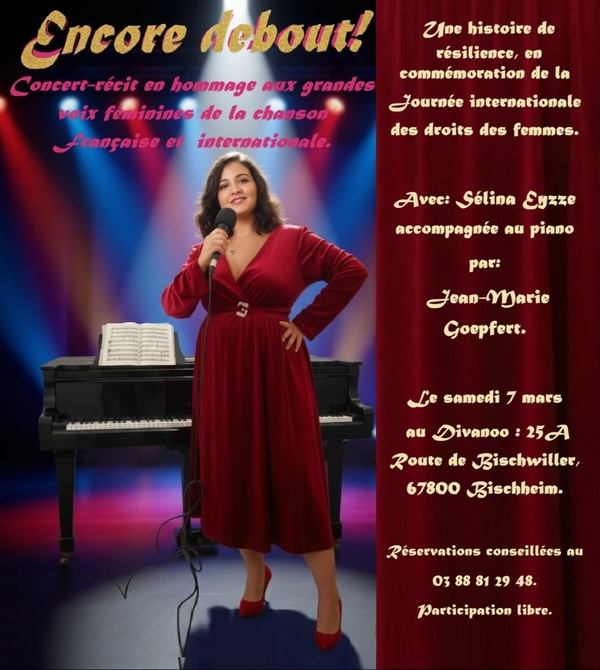 À l’occasion de la Journée internationale des droits des femmes, je vous invite à Encore debout ! Un concert-récit intime et engagé. Ça se passe le samedi 7 mars à 20h au Divanoo : 25A Route de Bischwiller, 67800 Bischheim. Avec une participation libre. J’y livre ma voix et mes combats de femme à travers une narration poétique et des chansons de grandes artistes femenines de la scène française et internationale : Aretha Franklin, Gloria Gaynor, Édith Piaf, Lara Fabian, Anne Sylvestre, Alicia Keys, Barbara, Dalida, entre autres, ainsi que des compositions personnelles. Voix et piano au service de l’émotion et de la mémoire. Accompagnée par le sensationnel pianiste Jean-Marie Goepfert.