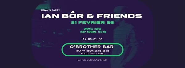 Downtempo · Organic House · Deep Minimal TechnoAprès les teufs du Jardin-Serre, Ian Bôr & friends vous invitent à raviver la flamme, accompagné de son compère Seb Blender, au O’Brother Bar…Entre éclectisme et profondeurs hypnotiques, Seb Blender et Ian Bôr partageront leurs univers à travers un mix complice et immersif, jusqu’à 01h00 du matin … Seb Blender