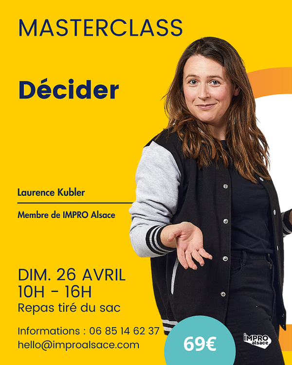Description atelier : Construire une histoire, c'est choisir : un prénom, un lieu, une intrigue,... Choisir c'est renoncer. Par peur d'être rude ou trop directif, on a parfois du mal à assumer ces prises de décisions. Résultat, les débuts d'impro sont longs, flous, et on avance peu. Dans cette formation, nous aborderons donc l'importance de la prise de décision en impro, ce qui peut la ralentir ou l'empêcher, et surtout comment se lancer et oser décider ! Cette formation m’a aidé à prendre un tas de décisions dans ma vie. (Forrest Gump) L'intervenante : Laurence est venue au monde de l'impro il y a une vingtaine d’années. Elle y a grandi en pratiquant le match d’impro, avec plusieurs participations à des tournois mondiaux, et un titre de champion du monde en 2015. Aujourd’hui, elle prend plaisir à jouer tous types de formats, et à animer des ateliers pour transmettre ses réflexions sur l’art d’improviser. Depuis une quinzaine d'années, elle coache différents groupes, de différents niveaux. Comme elle n'y connaît rien à la physique quantique, elle enseigne plutôt le plaisir d'improviser des histoires et le bonheur de se surprendre, affinant au fil du temps les exercices proposés. Il lui tient à cœur de s'adapter à chaque groupe, pour permettre à chacun de progresser à son rythme. Elle aime rendre sa démarche et la progression de ses ateliers claires, en fournissant des repères aux participants tout au long de ses ateliers. Son but est de proposer des outils que chacun pourra ensuite s'approprier et réinvestir à sa manière. Organisation : Le dimanche 26 avril 2026 : 10h-16h 11 Rue Sainte Agnès, 67100 Strasbourg Repas tiré du sac Animé par Laurence Kubler Nombre de places : 12 maximum pour des conditions idéales Infos : hello@improalsace.com Pré-requis : ce stage explore une thématique précise de l’improvisation et convient à des personnes initiées au théâtre d’impro ou expérimentées. Si vous avez un doute, écrivez nous ;-) Si vous avez des contraintes physiques que vous souhaitez porter à notre connaissance afin que nous puissions vous accueillir au mieux, merci de nous l'écrire ici.