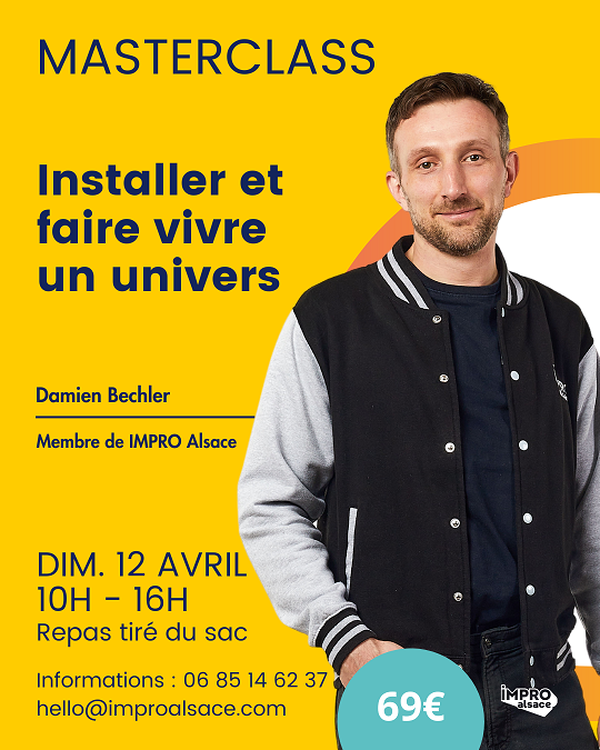 Description atelier : Vous voulez donner plus de couleur à vos improvisations, transformer une simple saynète en une épopée digne d’un blockbuster hollywoodien ? Cette formation sur les Univers vous permettra de donner vie aux mondes que vous explorez sur scène et d’enrichir vos récits pour captiver le public. Objectifs de la formation : Apprendre à colorer et dynamiser l’espace scénique pour donner plus de consistance à l’atmosphère que vous souhaitez créer. Utiliser un canevas simple inspiré du monomythe (ou "voyage du héros") pour structurer votre récit. Avec le groupe, nous choisirons deux univers spécifiques à explorer en profondeur. Ces univers seront décidés ensemble durant la pause déjeuner. Entrez dans la porte des étoiles et découvrons ensemble une nouvelle dimension L'intervenant : Damien Bechler pratique l’improvisation théâtrale depuis 16 ans et forme des comédien·ne·s depuis plus de 12 ans. Membre de plusieurs compagnies strasbourgeoises, il a participé à de nombreuses compétitions internationales de match d’impro. Pédagogue et rigoureux, il accorde une attention particulière à la construction d’univers riches tout en veillant au bien-être de chacun. On dit de lui qu’il est hyperactif, passionné de clips de K-pop, de cinéma hongkongais et amateur de bonnes bières (il a déjà bu une Westvleteren 12). Steven Spielberg aurait dit de lui : « I know this guy. » Organisation : Le dimanche 12 avril 2026 : 10h-16h 11 Rue Sainte Agnès, 67100 Strasbourg Repas tiré du sac Animé par Damien Bechler Nombre de places : 12 maximum pour des conditions idéales Infos : hello@improalsace.com Pré-requis : ce stage explore une thématique précise de l’improvisation et convient à des personnes initiées au théâtre d’impro ou expérimentées. Si vous avez un doute, écrivez nous ;-) Si vous avez des contraintes physiques que vous souhaitez porter à notre connaissance afin que nous puissions vous accueillir au mieux, merci de nous l'écrire ici.