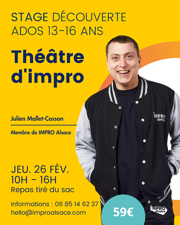 IMPRO Alsace vous propose un stage d’une journée d’initiation à l’improvisation théâtrale, sous le signe de la convivialité ! Une journée d'impro tous niveaux pour les ados de 13 à 16 ans. Votre jeune pourra découvrir de façon ludique et bienveillante l’improvisation, et ses multiples aspects que nous aborderons avec des exercices guidés : bouger, jouer, imaginer, créer, avoir confiance en soi et les autres, raconter des histoires, créer des personnages, mimer et le tout dans le fun ! Le jeudi 26 février 2026 : 10h-16h 11 Rue Sainte Agnès, 67100 Strasbourg Repas tiré du sac Animé par Julien Mallet-Cosson Nombre de places : 12 maximum pour des conditions idéales Infos : hello@improalsace.com