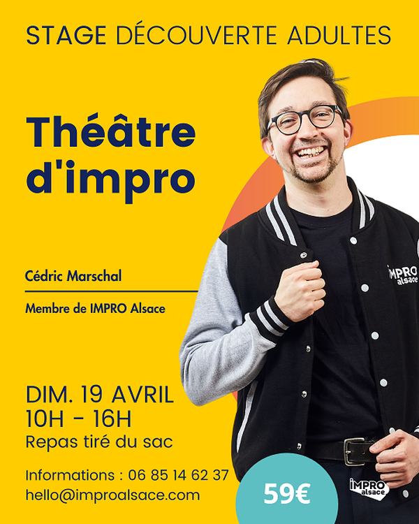 Stage Découverte de l'Impro pour Débutant.es IMPRO Alsace vous propose un stage d’une journée d’initiation à l’improvisation théâtrale, sous le signe de la convivialité ! Venez découvrir de façon ludique et bienveillante l’improvisation, et ses multiples aspects que nous aborderons avec des exercices guidés : avoir confiance en soi et les autres, raconter des histoires, créer des personnages, mimer et le tout dans le fun ! Intervenant : Cédric est membre et co-fondateur de la Cie IMPRO Alsace, ainsi que comédien et formateur d'impro dans différentes compagnies à Strasbourg, et dans le monde, dont Anananas & Pampamplemousse et The Fraltons. Sa vision de l'impro est de partager, apprendre et transmettre autant que possible, c'est pourquoi il a arpenté pas moins de 19 pays en Europe et outre-Atlantique pour jouer et enseigner. A Strasbourg, il est prof régulier de l'Ecole d'IMPRO Alsace ; partout dans le monde, il donne des ateliers ponctuels sur les sujets qu'il aime. Son style et celui d’IMPRO Alsace peut être décrit comme explosif, sincère, physique et débile. Il adore que le corps soit investi en jeu, et c'est ce qu'il veut apporter à ses spectacles et son coaching. Le dimanche 19 avril 2026 : 10h-16h 11 Rue Sainte Agnès, 67100 Strasbourg Repas tiré du sac Animé par Cédric Marschal Nombre de places : 12 maximum pour des conditions idéales Infos : hello@improalsace.com Si vous avez des contraintes physiques que vous souhaitez porter à notre connaissance afin que nous puissions vous accueillir au mieux, merci de nous l'écrire ici.