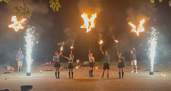 Un spectacle magique de jonglage de feu pour illuminer le parvis de la médiathèque.