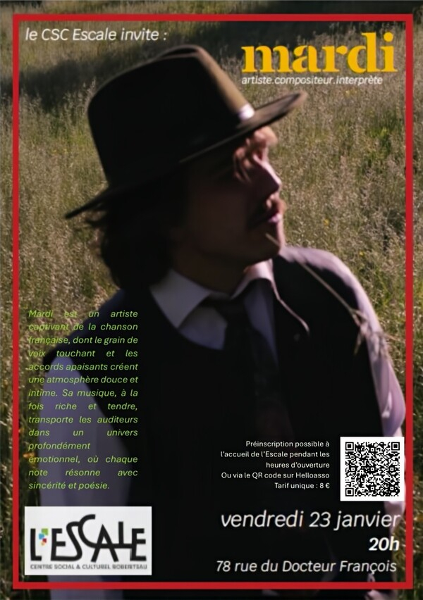 Tarif : 8 € - préinscription à l'accueil du CSC Escale - sur le lien https://www.helloasso.com/associations/centre-social-et-culturel-de-la-robertsau-l-escale/evenements/concert-mardi - via le QR code sur Helloasso (voir affiche)