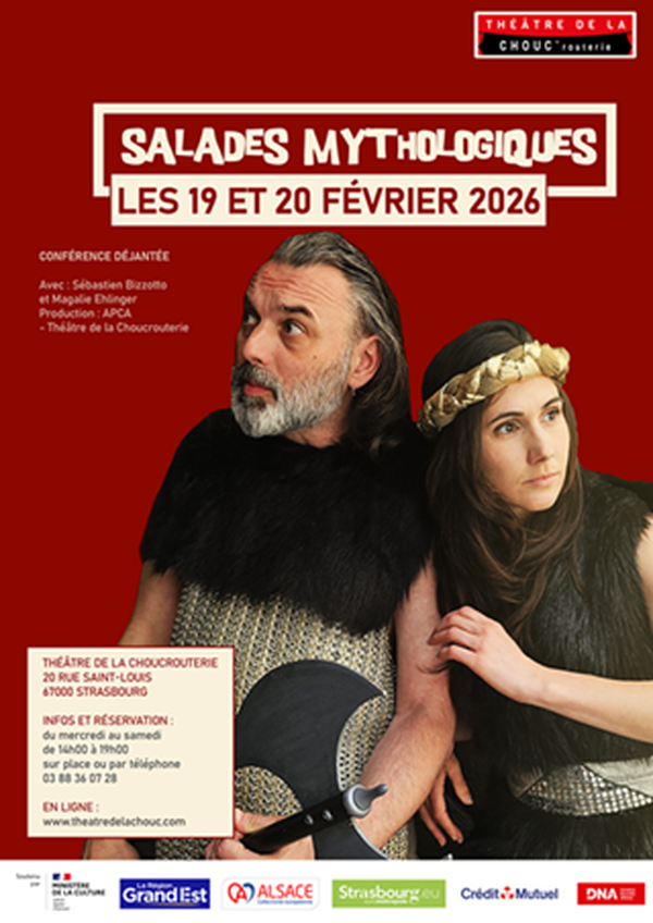 Magalie Ehlinger et Sébastien Bizzotto sont comédiens, mais pas que ! Magalie a en plus un bagage universitaire spécialisé en archéologie et Sébastien a lu plein de livres sur la mythologie quand il avait 10 ans. Passionnés par les histoires des légendes de l’antiquité, leur rêve est de vous emmener à la découverte des mythologies grecques, égyptiennes, nordiques, celtiques et plein de mots en -ique avec la folie et l’humour qui les caractérisent. Une conférence complètement barrée comme un voyage aux côtés d’Athéna, Isis, Thor ou Toutatis.