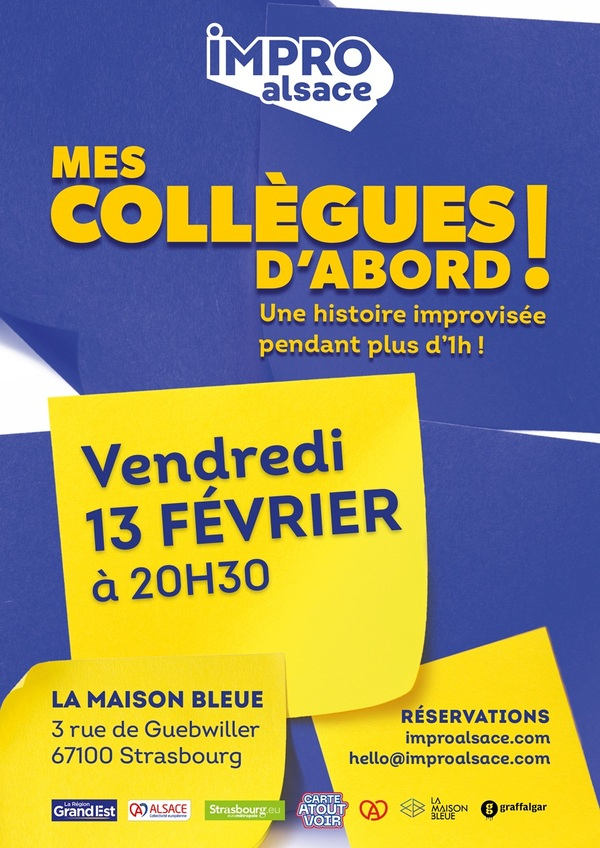 Mes collègues d'abord est LE spectacle longform d'IMPRO Alsace. HEIN ? Longform ? Le longform est une forme de spectacle d'improvisation théâtrale qui consiste à créer intégralement une pièce de théâtre improvisée. Nous prenons quelques suggestions du public au début du spectacle, puis nous improvisons non-stop durant 1 heure ! C'est comme une pièce de théâtre écrite, sauf que celle-ci n'est pas écrite ! Mes collègues d'abord est un spectacle où le public suggère un lieu de travail à nos comédiens et ceux-ci vont vous montrer la vie animée de cette entreprise et de ses collaborateurs. Un.e metteur.se en scène sera présent.e afin de donner occasionnelement des consignes et enrichir ce qui sera déjà proposé par les commédien.ne.s. SPECTACLE TOUT PUBLIC Avec Amandine Hobbé, Cédric Marschal, Julien Mallet-Cosson et Pauline Vernier Maître du jeu : Dan Seyfried Musiciens : Valentin Stab et Pierre Haessler