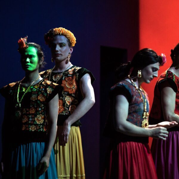 Sous les fleurs est un nouveau conte dansé de Thomas Lebrun après …de bon augure (2020), où le chorégraphe proposait une déambulation aussi facétieuse que pudique dans sa volière musicale. Aujourd’hui, ce sont des fleurs : des couronnes qui ceignent des cheveux tressés, les broderies aux couleurs vives qui ornent caracos et jupes. Les fleurs : les sourires et les embrassades lentes. Des silhouettes chatoyantes cousent, se confient silencieusement et se coiffent mutuellement – ce sont des mains qui dessinent dans l’espace et des bras qui le caressent. La pièce tient du documentaire : chez les Zapotèques, les Muxes, nées masculines, vivent pleinement leur féminité, au sein même du groupe sans toutefois avoir le droit de convoler. Comme un miroir inversé, en Occident où deux hommes peuvent faire couple, cette féminité est traquée. Traversés par ces paradoxes, les corps des cinq danseurs finissent par se troubler et verser dans une expressivité plus onirique, proche de celle de Pina Bausch.