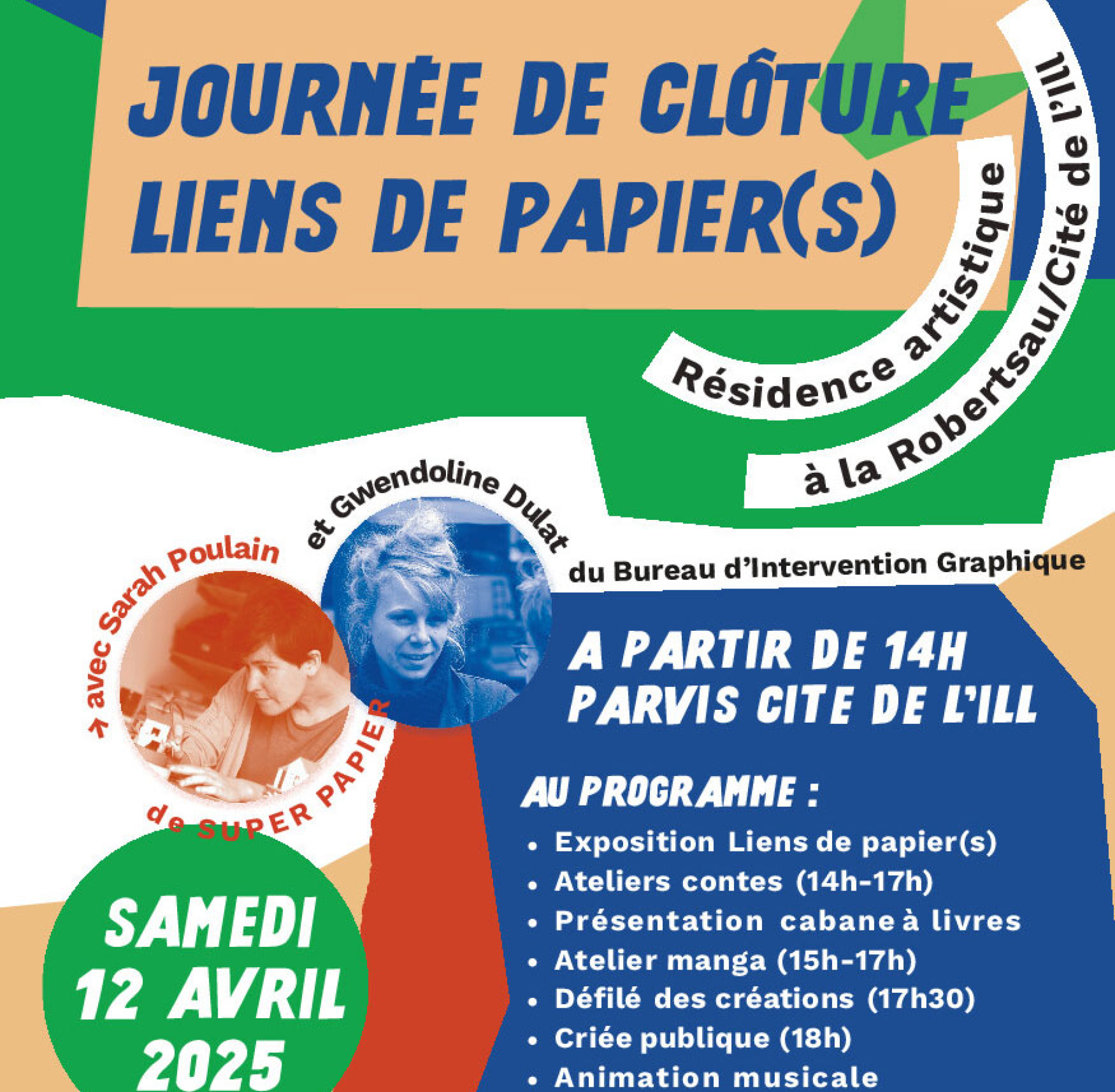 • Journée de clôture festive de la résidence artistique "Liens de Papier(s)" au local atelier (ancienne boulangerie) et sur le parvis de la Cité de l’Il, le samedi 12 avril à partir de 14h avec :
