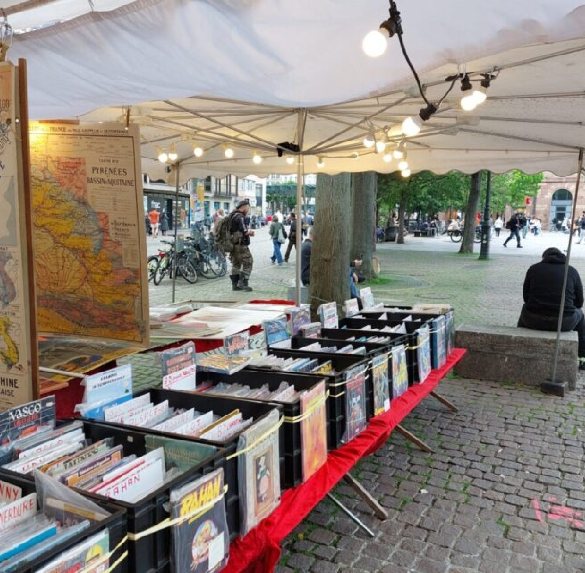 Tous les mardis, jeudis et samedis, les irréductibles vendeuses et vendeurs d’ouvrages investissent le début de la rue des Hallebardes et la place Kléber. Qu’il vente ou qu’il neige (la fragilité de leurs éditions leur faisant tout de même fuir la pluie, malgré les tonnelles qui les protègent), ils et elles sont là, invariablement.